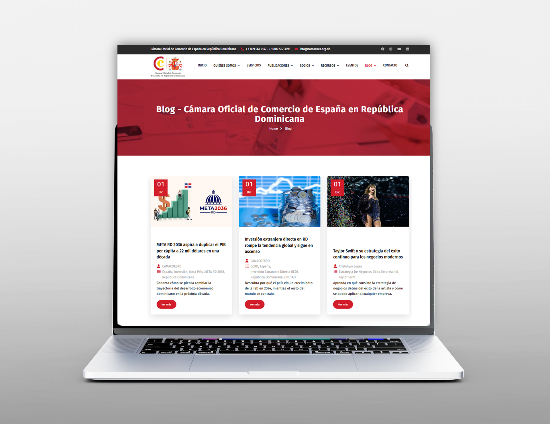 En su estrategia de comunicación digital, la Cámara de Comercio Española en República Dominicana (CAMACOES) necesitaba una herramienta para mantenerse cercana a sus socios, compartiendo información relevante y generando tráfico hacia su sitio web. Para ello, propusimos una newsletter digital con contenidos sobre economía, comercio, comunicación y liderazgo. La publicación mensual refuerza su posicionamiento como fuente confiable en el entorno empresarial.