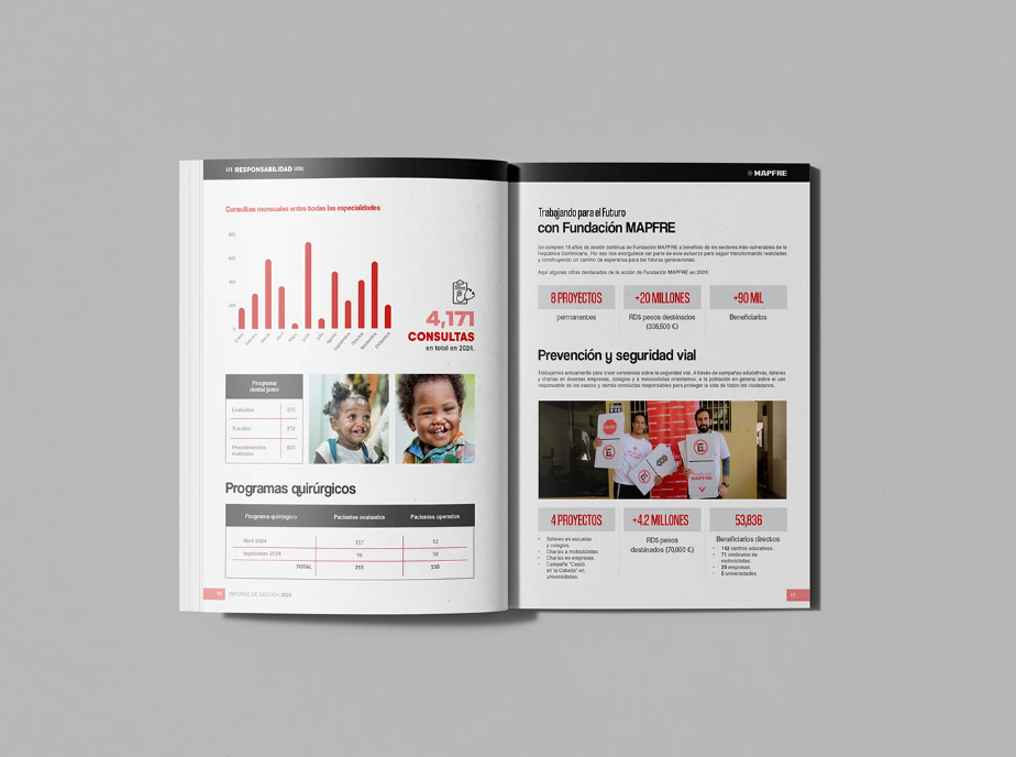 Con un enfoque en la trayectoria local y las acciones estratégicas de la aseguradora, hemos abordado cada una de las memorias institucionales de MAPFRE. Cada informe es concebido como una pieza clara y moderna donde plasmamos los logros de la institución al servicio de sus clientes y usuarios.